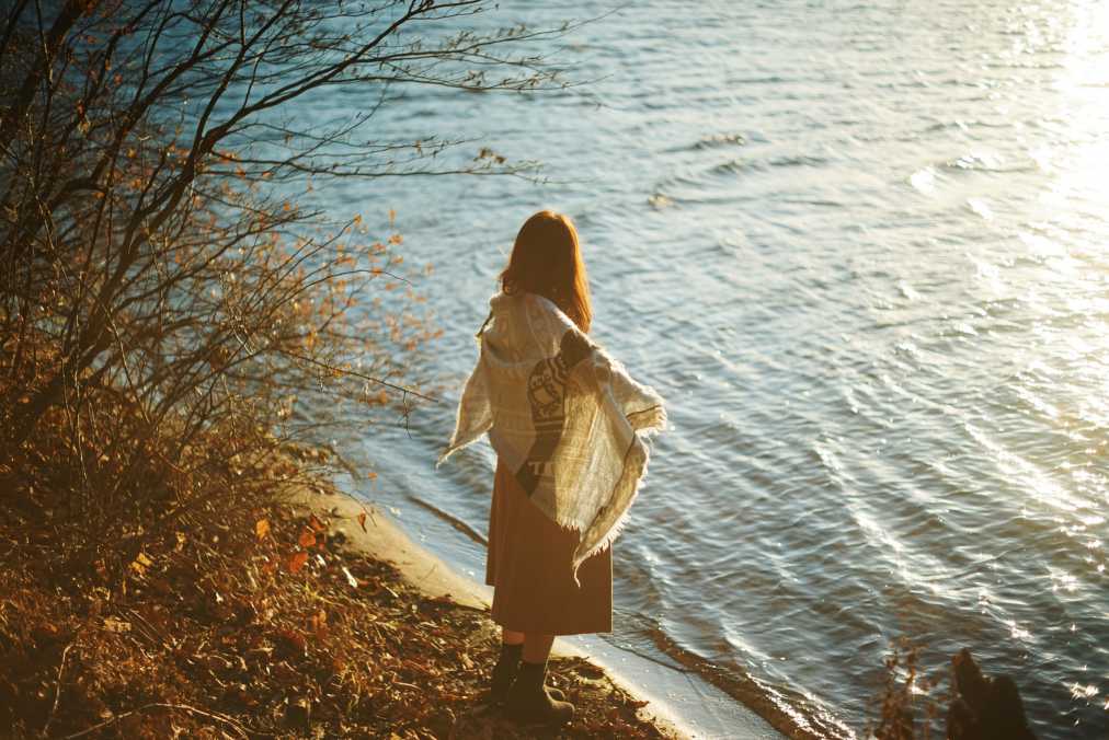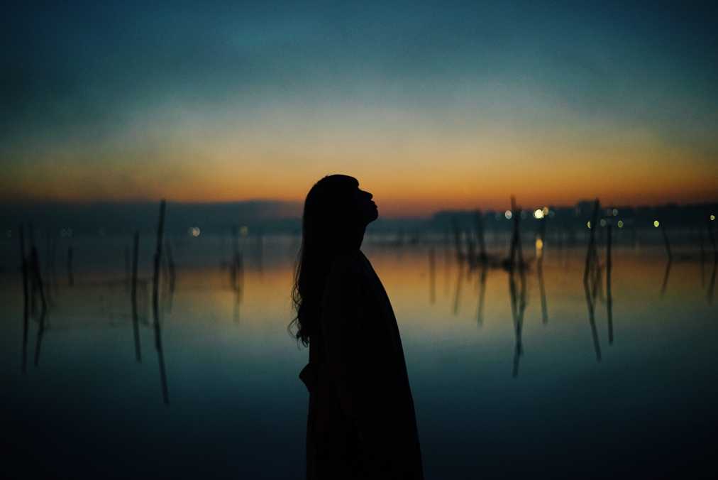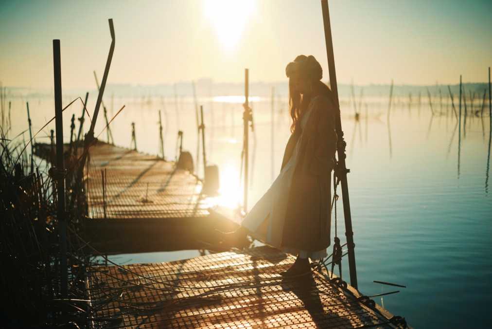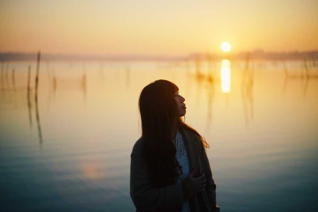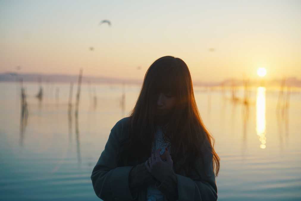 夕焼けに髪が透けて、湖の青色と、オレンジ色の対比が綺麗です。