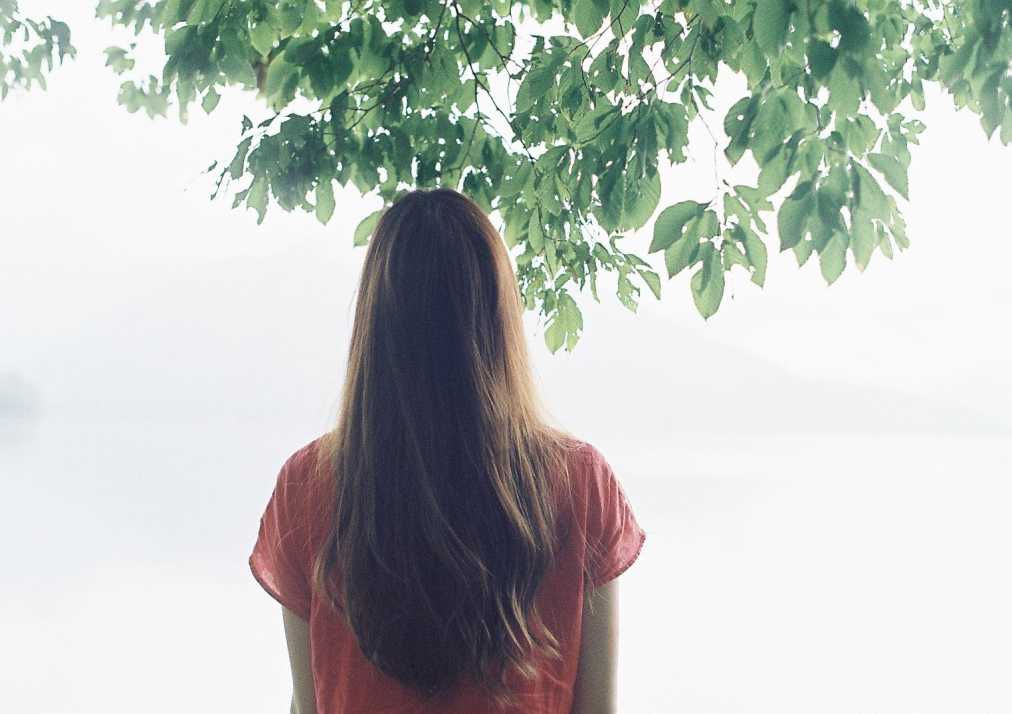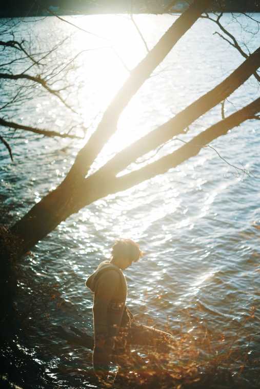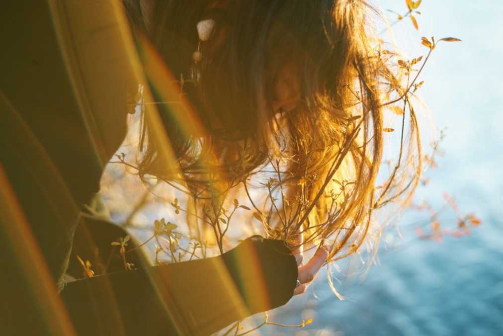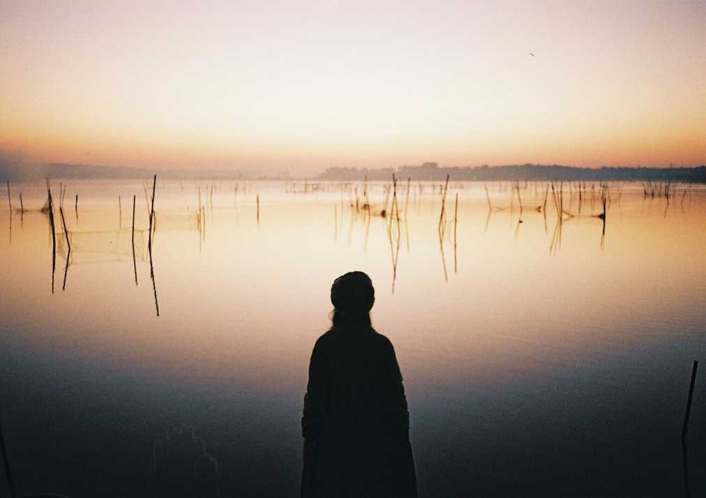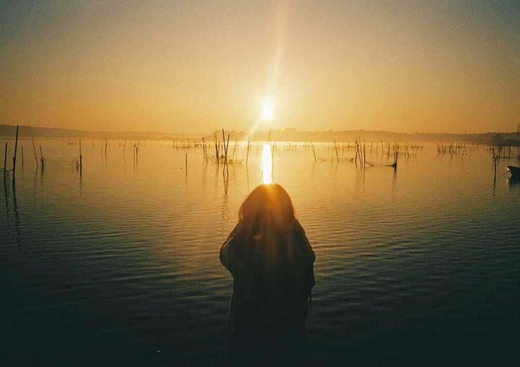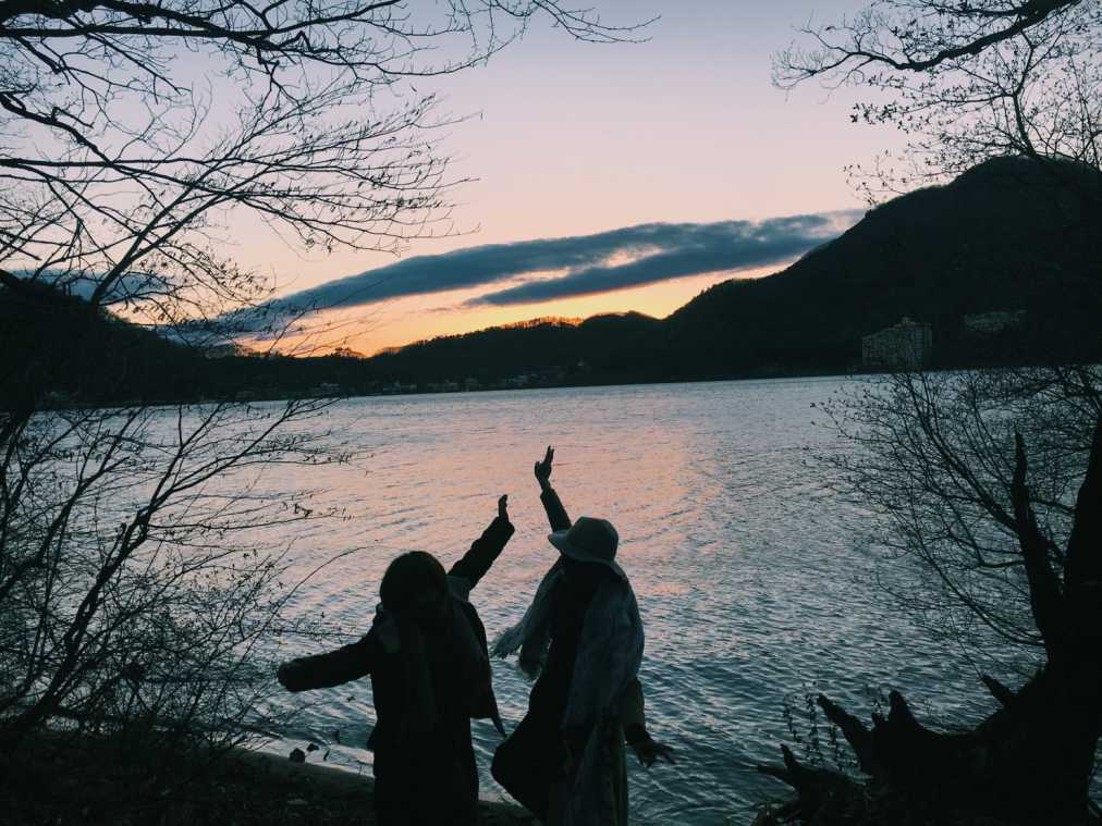 夕焼けに髪が透けて、湖の青色と、オレンジ色の対比が綺麗です。