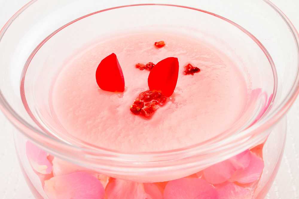 料理は、アミューズから始まり、前菜・スープ・魚料理・肉料理・デザートの全6品。どれも旬のフルーツをふんだんに使った、爽やかなメニューに仕上げられています。花びらが浮かんだ、ひんやり冷たい「白桃スープ」はカワイイ色合い。