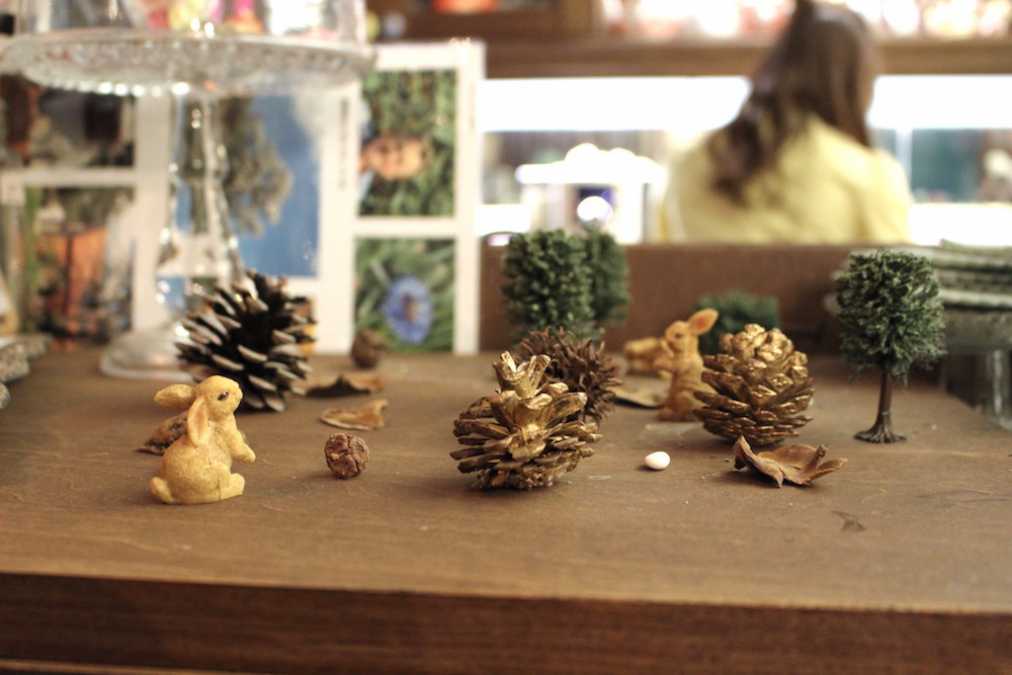 カウンターの上は小さな展示スペースに。松ぼっくりと木に囲まれて、2匹のうさぎがかくれんぼ。物語のワンシーンのようで和やかな気持ちになります。