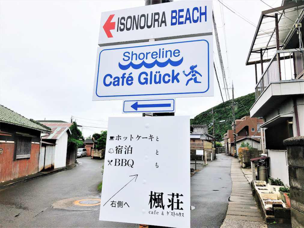 海水浴で人気の磯の浦ビーチ近くの狭い路地。「こんな場所に本当にあるの?」と不安になりながらも進んで行くと、突然素敵な空間が目に飛び込んできます。元々はガレージだったという建物を、オーナーさんのセンスでお洒落にリノベーションしたという「カフェ楓荘」。二段重ねになっているホットケーキが話題なんです。