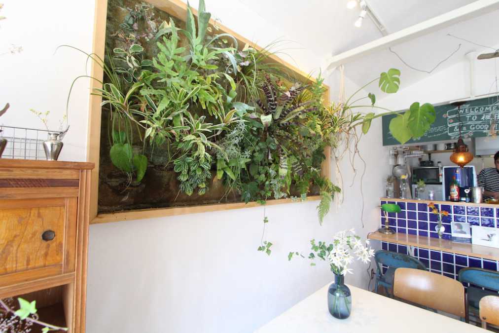 壁を見て一瞬ビックリ!?観葉植物で埋め尽くされた大きなフレームは、オーナーさんの作品。ヨーロッパの映画からインスパイアした作品は、じっくり眺めているだけで癒されます。