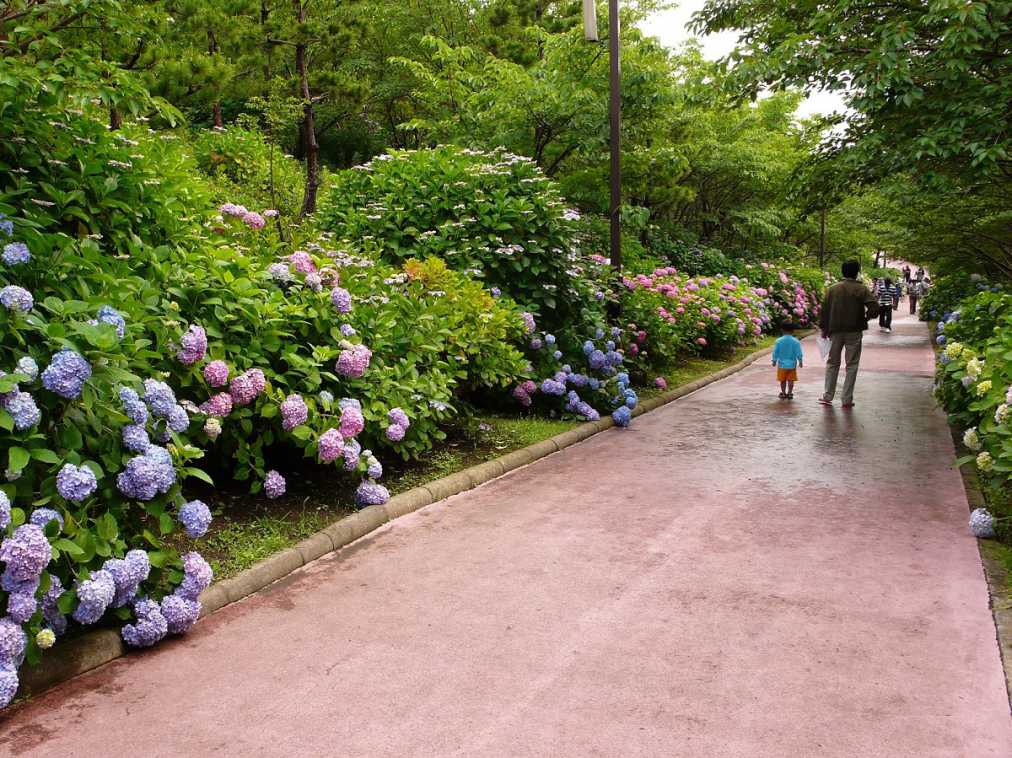 西浜から丘の広場まで上がる「あじさい坂」(写真)や、丘の広場からカーニバルハウスまで下る「あじさいの花道」にも、たくさんのアジサイが咲き誇ります。