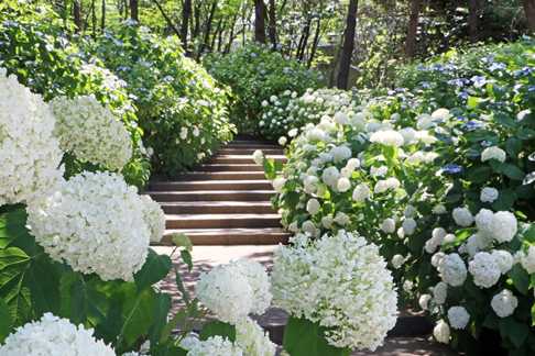 白いあじさい「アナベル」が、まるで流れ落ちる滝のように咲き誇るメインストリート「あじさいの滝」。