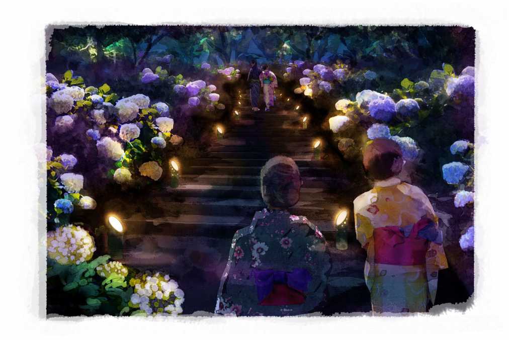 今年は夜も楽しめるよう竹灯籠が設置され、昼間とはまったく違ったムードに。優しい光に包まれる色とりどりのアジサイは、浴衣姿にも映えそう!