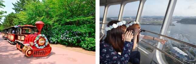 期間中は、うれしい特典付きの「見どころスタンプラリー」や、車窓からアジサイを楽しめる特別ルートで運行する「あじさいトレイン」が登場。「シーパラダイスタワー」では双眼鏡と花冠を無料で貸し出してもらえます。上空90mからのあじさい島の風景を堪能してみては。