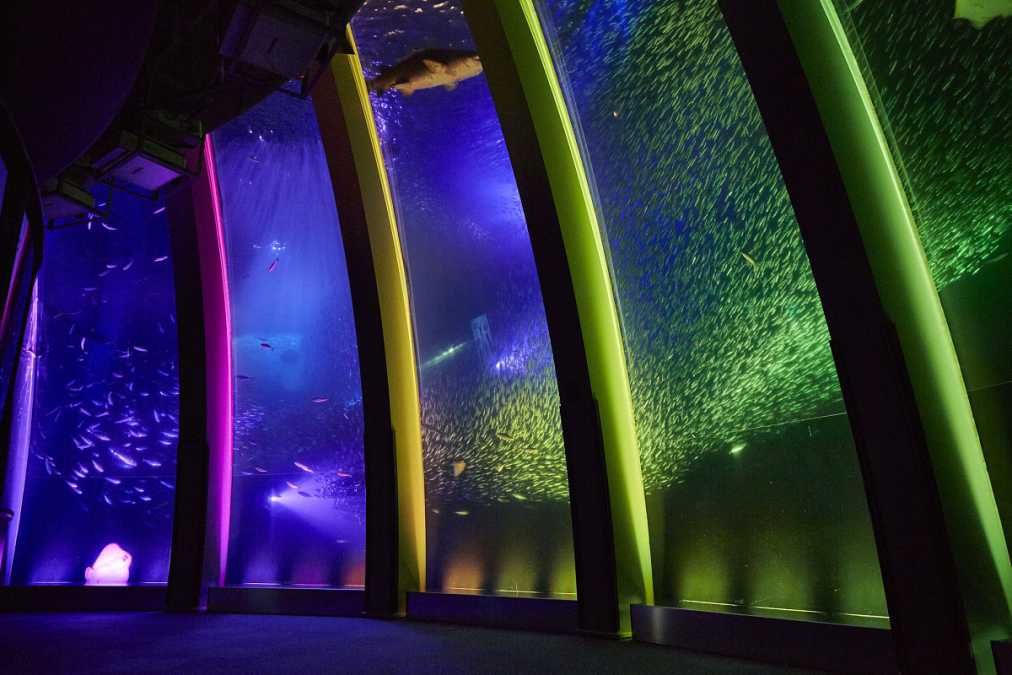 ロマンティックなムードに浸るならココ!アクアミュージアムでは、イワシの群舞とアジサイのようにカラフルなライティングがおりなす幻想的なパフォーマンス「スーパーイワシイリュージョン」が開催されています。