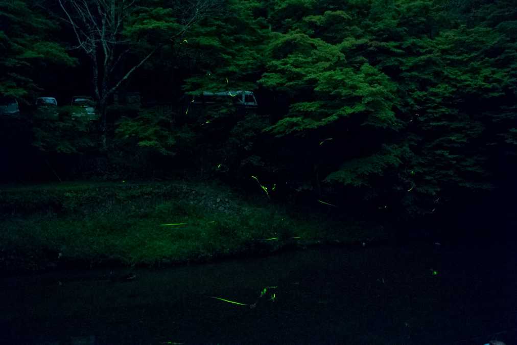 20時過ぎには川床席のすべての明かりが消され真っ暗に。やがて、ぽつりぽつりと暗闇を飛び交う源氏ぼたるの光が見えてきます。幻想的な風景に、しばし言葉を忘れて見入ってしまいます。