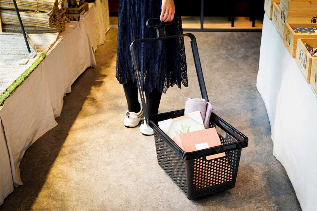 ヨーロッパでよく見られる、キャスターがついていて転がして引っぱれるタイプの買い物かごがすごく便利!これなら、アイテムをたくさん詰め込んで店内を回っても疲れませんね。