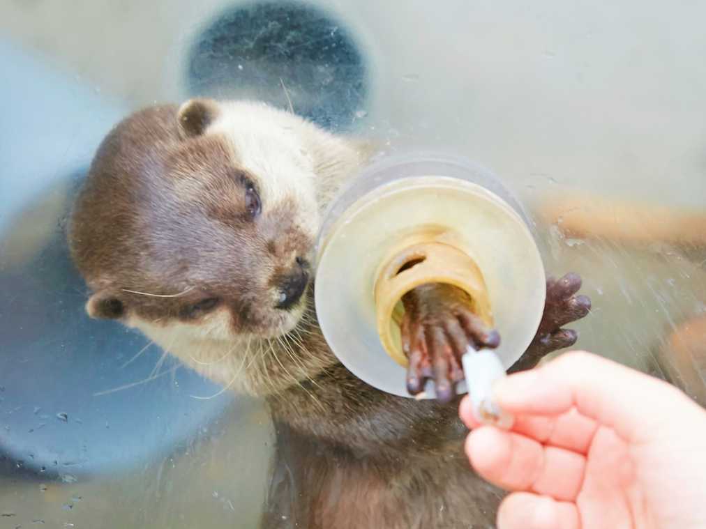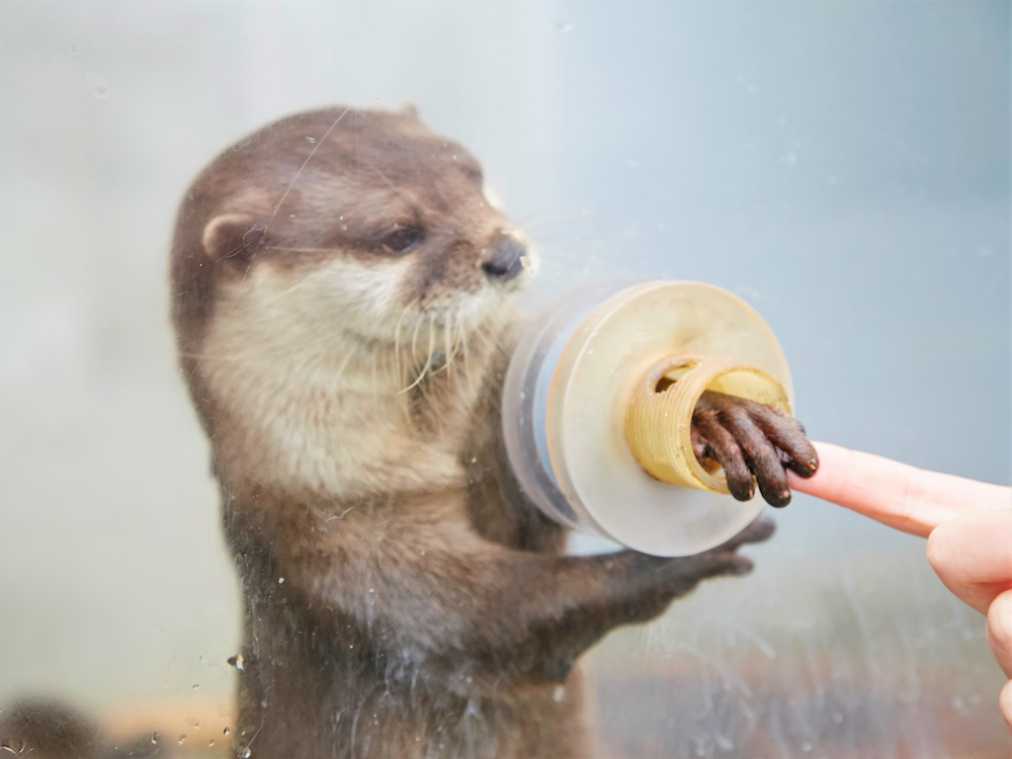 大好物のワカサギをそっと差し出すと指をキュッとつかんで握手をしてくれるカワウソ。想像よりかなりふにゃふにゃで、赤ちゃんの手のようでした。手の大きさや感触で例えるなら、リスザルっぽいです!