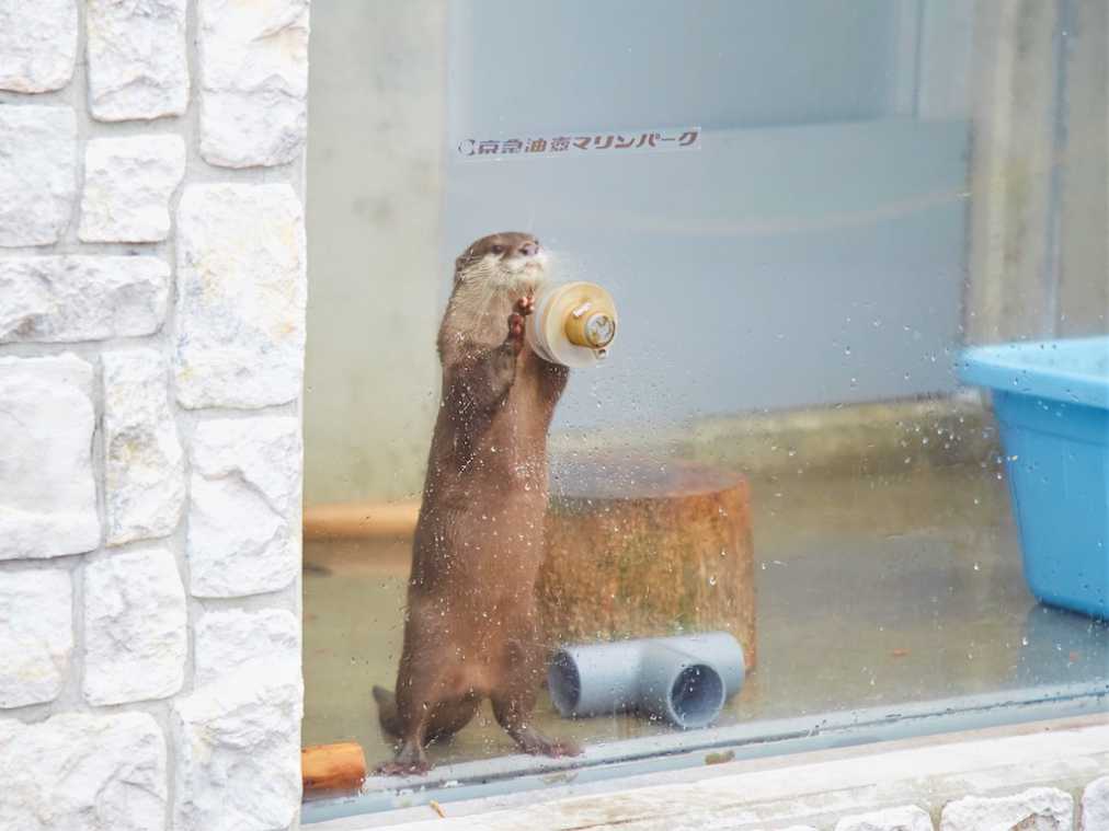 こちらが2013年にマリンパークで生まれた姉妹カワウソです!はしごに登ったり、透明な水槽内を半回転しながら泳ぐユニークな行動が観察できますよ。
