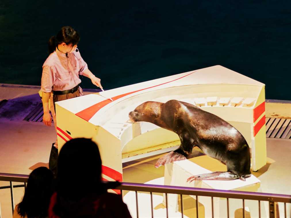 物語の中には、アシカが楽器を演奏したり、DJに扮する場面もあるんです!この日の演奏曲は『小さな世界』。バンドウイルカたちのコーラスにも注目です。
