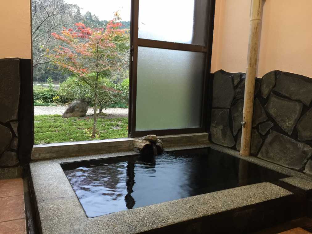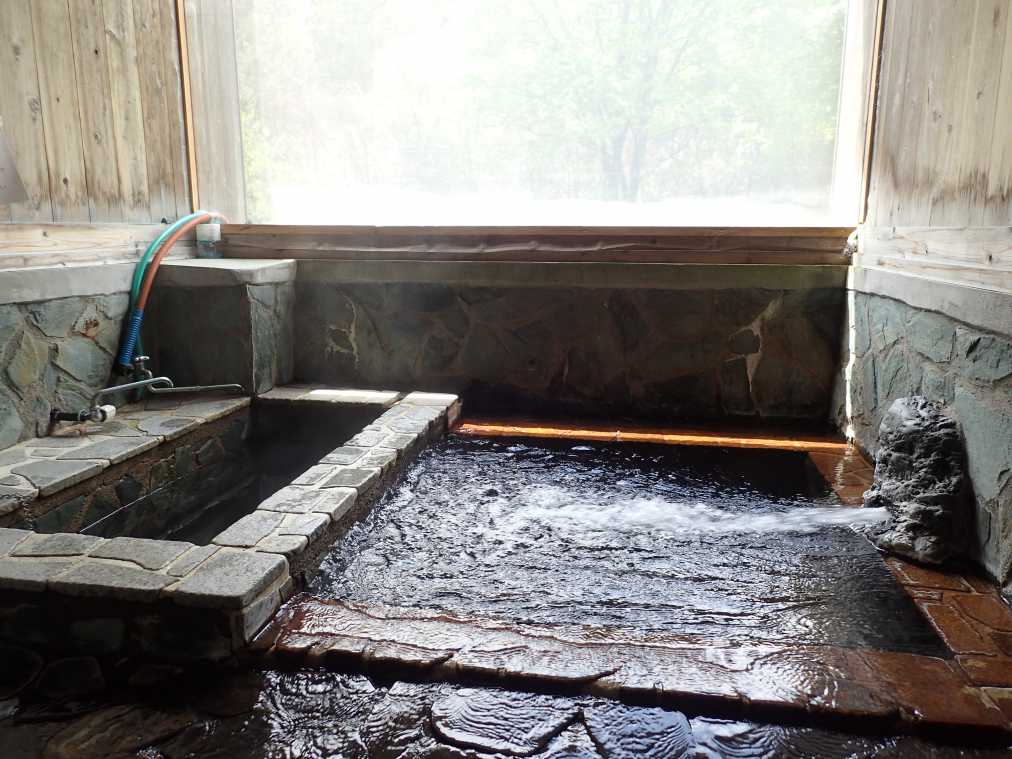 惜しみなく浴槽に注がれている温泉は、鉄分を含む酸性の湯。舐めると酸味と鉄味を感じます。炭酸ガスなどを少し含む温泉水は、温泉成分によりヌル湯にもかかわず、長時間入浴すると血流がよくなり、いつのまにかポカポカに温まりますよ。