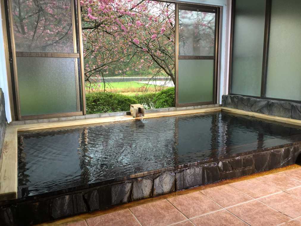 人吉温泉郷の中心部から少し離れたのどかな田園風景の中にぽつんと立っている華まき温泉は、その名の通り春になると辺り一面きれいな花々で彩られます。桜の時期が特に素晴らしく、湯船のすぐ目の前は八重桜。なんと花見風呂を楽しむことができるのです。