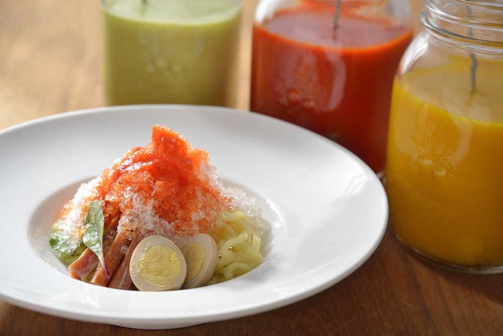世界バイキング「エトワール」の『夏の美味彩々フェア』食べ放題メニューのひとつとして提供される、塩味ベースの中華スープの氷を削り、具材とともに中華麺の上にのせた“かき氷”冷やし麺。かき氷のシロップのように、緑(甘い)、赤(辛い)、黄色(酸味)の3色のソースから、好みのソースをかけていただきましょう!【世界バイキング「エトワール」:地下1階】※フェアは6月1日(金)~8月31日(金)、ランチ 大人 3500~4000円、ディナー 大人 5800~6300円