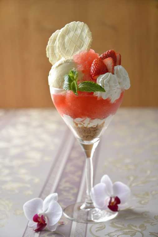 少しオトナなカクテル仕立てのかき氷はいかが?バニラアイス、クリームがトッピングされていて、見た目もカワイイ!ラムベースのカクテル「大人パフェ -ストロベリー-」2376円【カフェバー「トラックス」:2階】