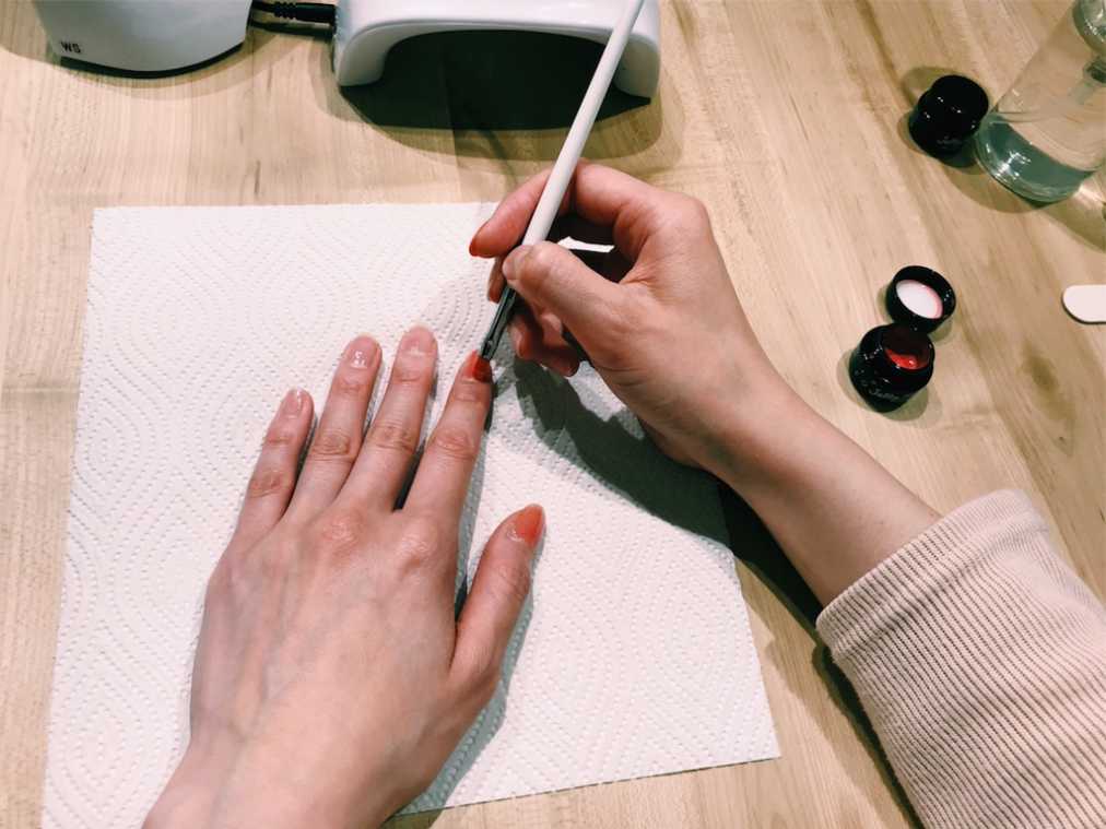 教わった内容を踏まえて、いよいよセルフネイルスタート! 一見難しそうなカラージェルですが、いざ筆で塗ってみるとマニュキュアとさほど変わらない印象。ポイントをおさえて練習すれば、もっときれいに塗れるようになりそう。