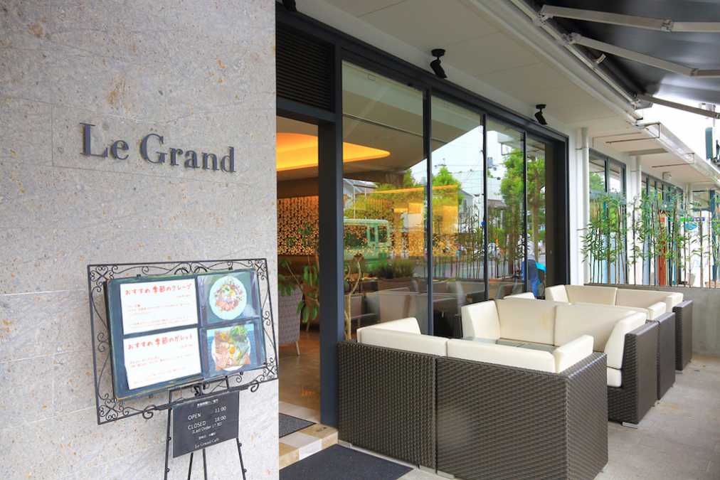 外観はガラス張りで、「Le Grand」と控えめに掲げられた店名がおしゃれ。お店の外にはソファのテラス席もあります。
