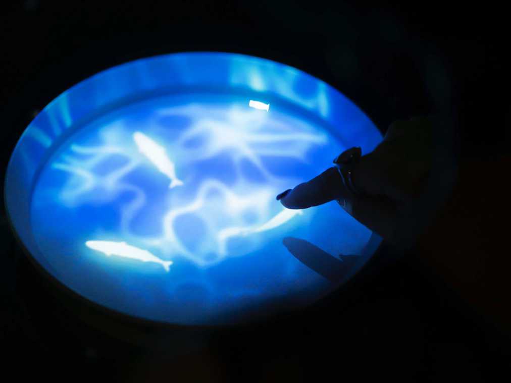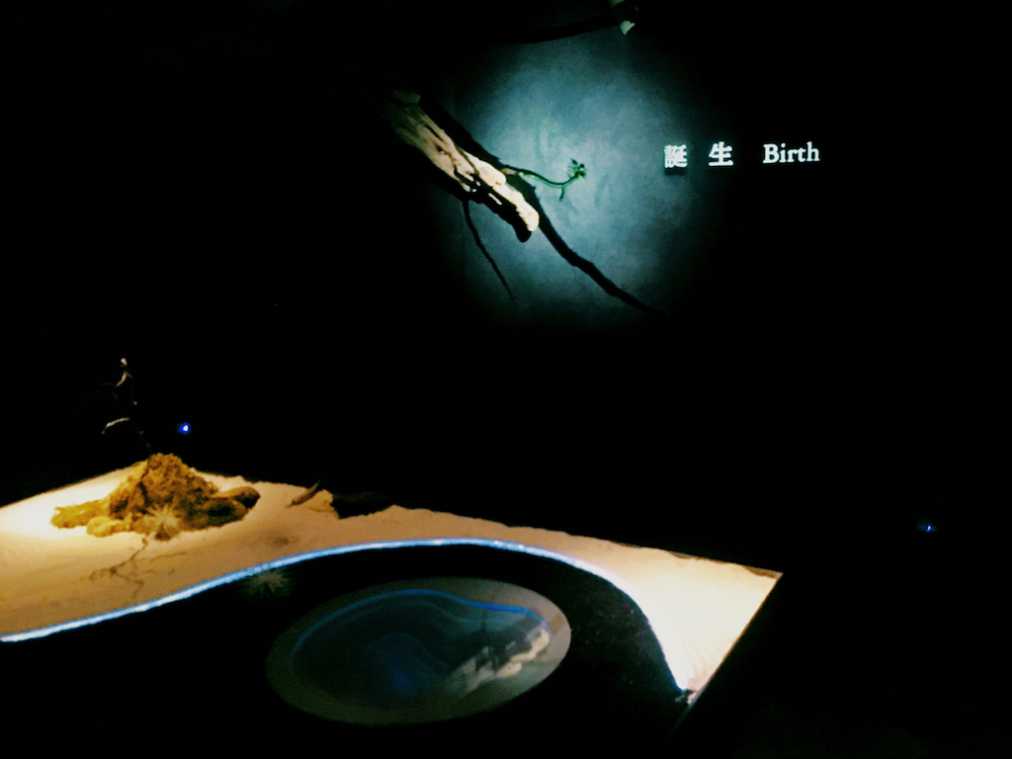 実はこちらのお魚、触ることができるんです。写真は「Expansion/拡張(魚料理)」のシーン。水が張られたお皿の上には魚たちの映像が!指先でつつくと、なんとお皿からテーブルに映る「川」へ逃げ出すのです。