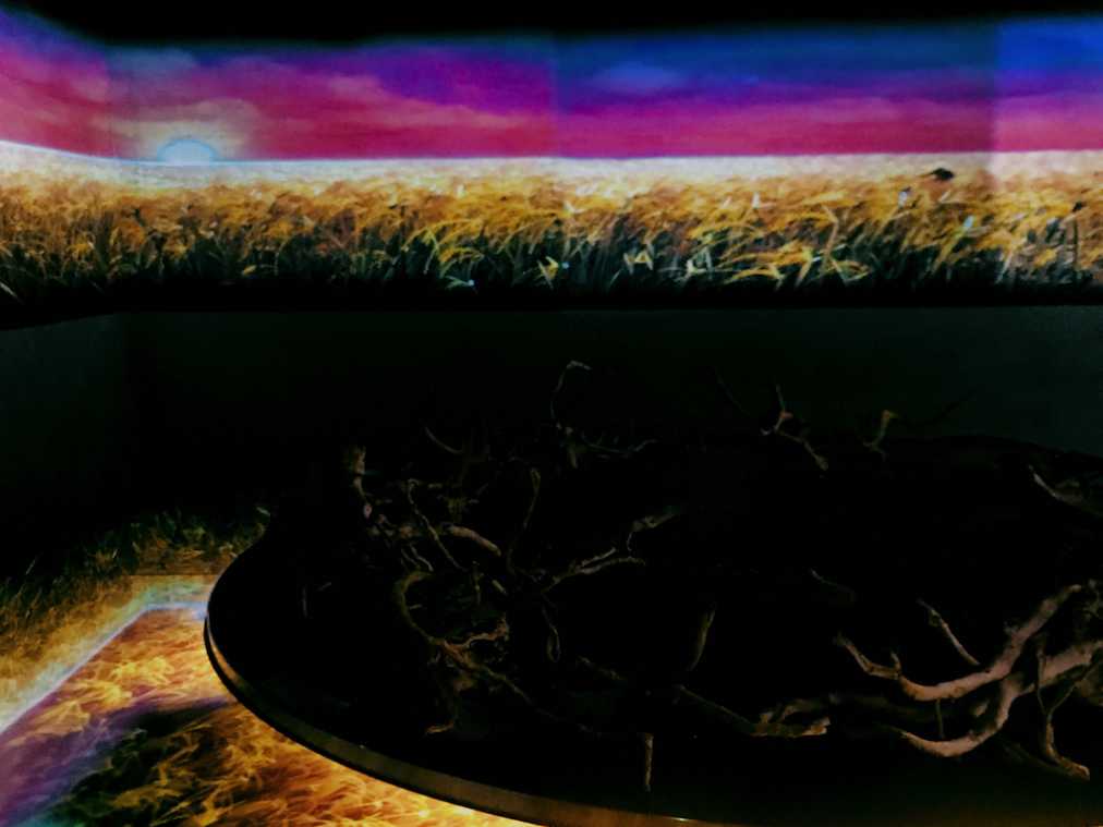 ひと通り説明を受けたら、いよいよ食事の時間!中央に大きな円卓が置かれた「Main Zone(メイン ゾーン)」に移動します。プロジェクションマッピングによる映像が壁やテーブル上へ次々と映し出され、とっても幻想的な空間に。