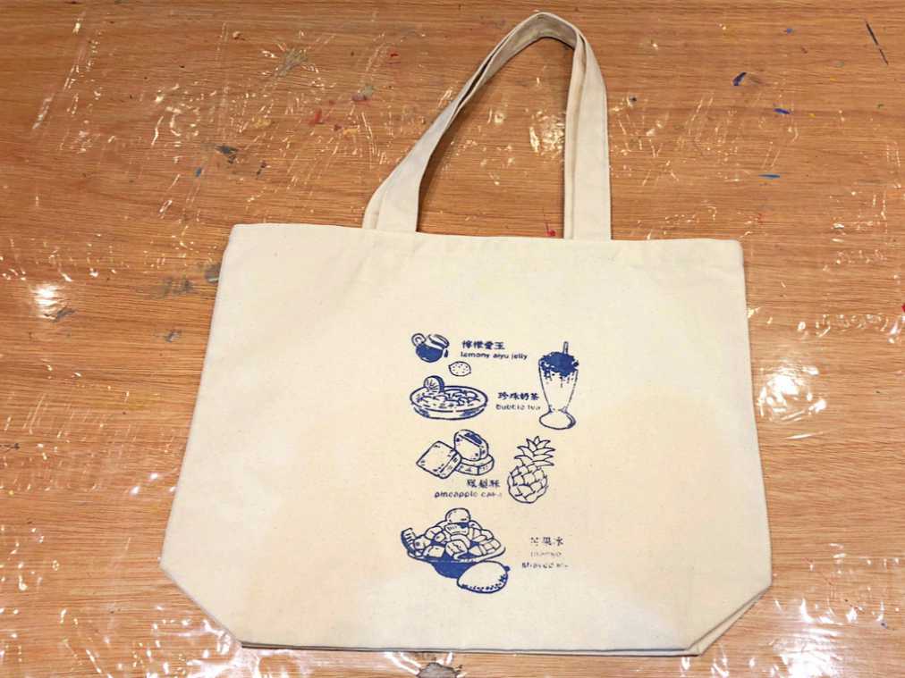 約10分ほどで完成したトートバッグはこちら!台湾のデザートが描かれた柄をチョイス。柔らかな藍色もスタイリッシュでお気に入り。予約なしで体験ができるので、立ち寄った際にぜひトライしてみてはいかがでしょう?