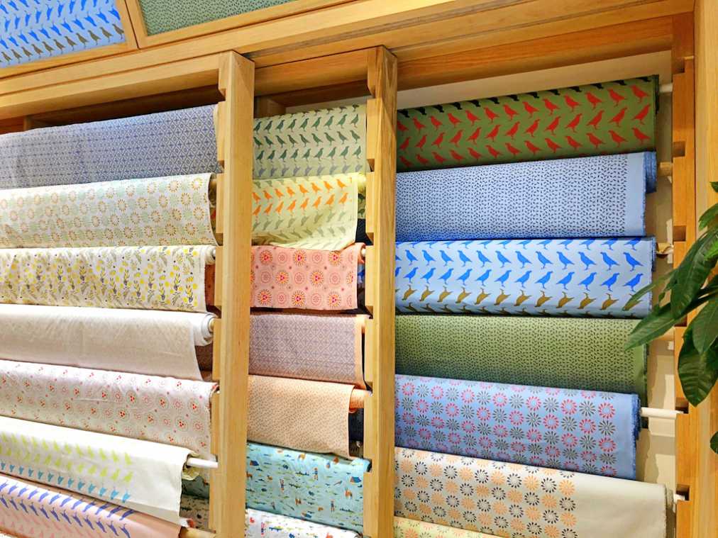 店内に入ると目に飛び込むのはキュートで華やかな柄アイテム!「inBlooom」は台湾で人気のテキスタイルショップで、生地から製品までたくさんのアイテムが並びます。かわいい小鳥柄のモチーフは台湾で古くから愛される「ハッカチョウ柄」をアレンジしたものなのだそう。