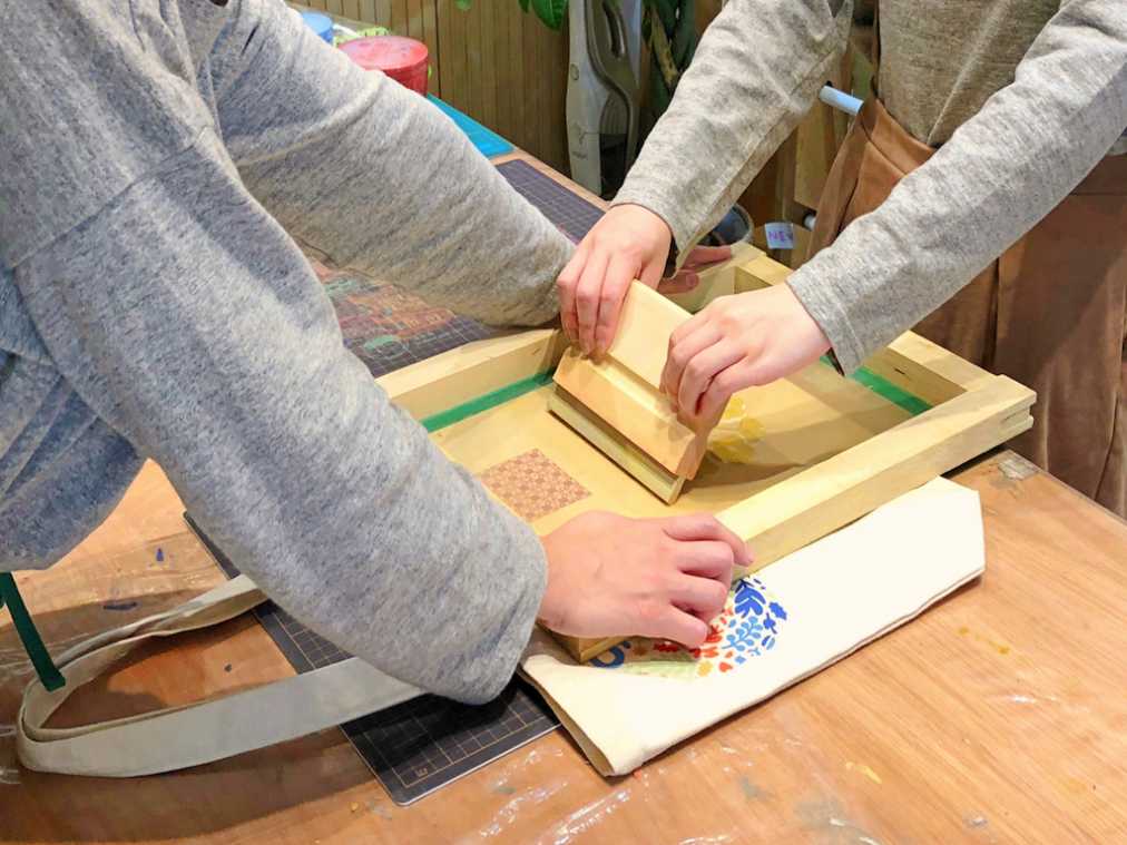 店内ではキャンパスバッグ(2360円)に自分の好きな「inBlooom」のプリント柄を刷るシルクスクリーン体験もできます!スタッフさんに教えてもらいながら、インクを乗せて布に柄を転写します。
