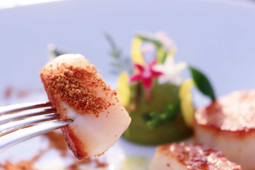 そのままでもホタテのうま味を感じますが、ベーコンをパウダー状にしたベーコンダストにつけると肉肉しい風味が加わり、シンプルなホタテの味わいがグッと変わります。