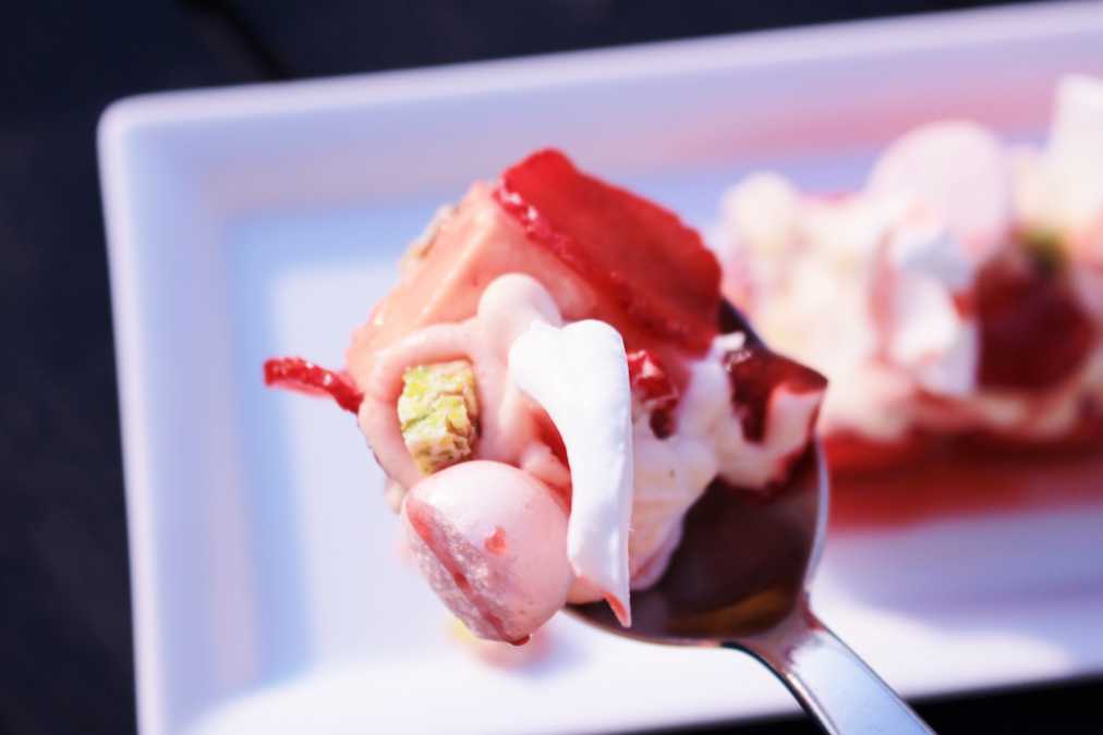 苺の甘酸っぱさが段階を追って感じられたあと、サクサクとしたクッキー生地やピスタチオのヌガーの香ばしさやメレンゲの甘さへと味覚が変化していきます。それはまるで変化してゆく夕焼けのように。