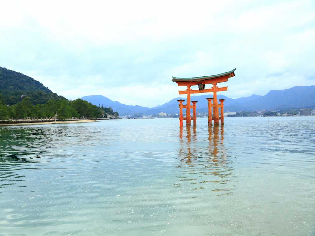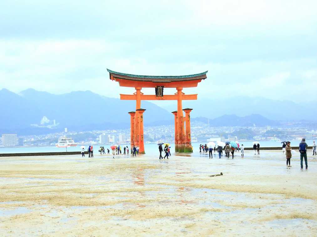 遠浅の浜辺に立つ嚴島神社は、潮の満ち引きの影響が大きく表れる場所。約6時間おきに繰り返す「干潮」と「満潮」で景色が一変することで有名です。干潮時には大鳥居の根元まで歩けることも。