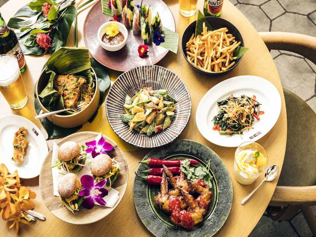 『カフェ&バー BeBu(ビブ)』の 「バリニーズパーティー」1人5500円(税・サ別)は、バリの料理をたっぷり楽しめるパーティープラン。定番の生春巻きやアヤムゴレンのほか、魚のバナナリーフ包み焼き、ルンダンのミニバーガーなど、夏らしいメニューがたくさん。2時間のフリードリンク付きなので、夜風が心地よいテラス席でビール片手にバケーション気分が味わえます。