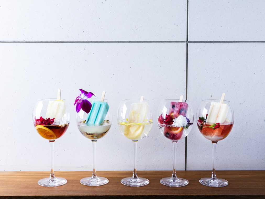 最上階に位置する『ルーフトップ バー』で提供されるのは、アイスバーを浸して楽しむカクテル「サマー アイスバーカクテル」1950円(税・サ別)。5種類のカクテルは、それぞれ世界各地の夏のシーンをイメージして作られています。