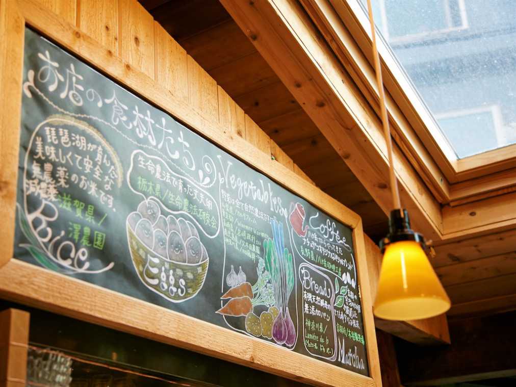 店内の黒板では、その日お店で使う新鮮なオーガニック野菜が紹介されています。産地や生育方法、生産者の名前などを分かりやすく表示。「ナチュデコ」のメニューが安心して食べられる証明書のようなものですね!