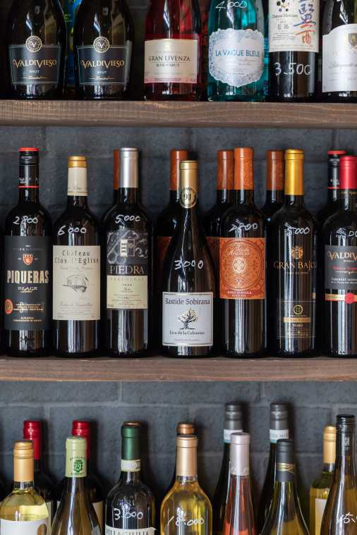 見てください!ずらりと並ぶワインボトルには、それぞれ値段が書かれています。ワインに詳しくなくても、気に入ったラベルで選ぶのもいいですね。