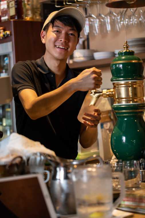 料理と合わせたいビールは、キンッと冷えたジョッキがうれしい。イケメン店員さんに注いでもらうと、おいしさも2割増しですね!