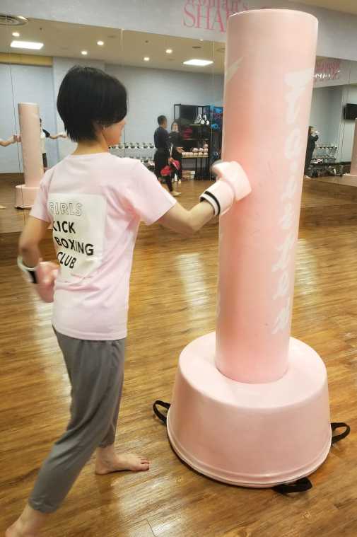 合間合間で息を整えながらパンチングバッグでも有酸素運動。こちらもお揃いのピンクで統一されています。
