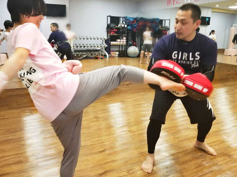 パンチの次は、キックの練習がスタート!当たり前ですが、人を蹴ることなんてこれまでの人生で無かったので、最初は少し躊躇。でも段々と蹴るコツを掴んでくると、しっかりミートして「バーン!!!!」とミットの音が響き渡り、それが最高に気持ちいい!
