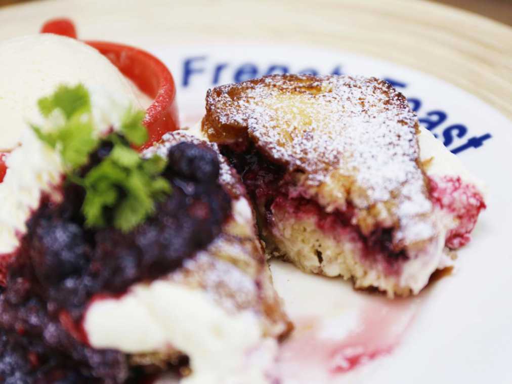 注文したのは、チーズケーキをフレンチトーストでサンドした「ベリーベリーチーズケーキ&フレンチトースト」。甘酸っぱいベリーソースが甘いフレンチトーストにさわやかさプラスした1番人気の商品です。