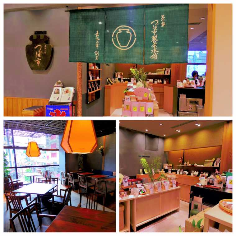 活気ある1階から2階に上ると見える、落ち着いた佇まいのお茶屋さんが「茶寮 つぼ市製茶本舗」。のれんをくぐるとお茶やお菓子などの物販コーナーがあり、お茶やお茶を使った甘味はその奥にある喫茶スペースで食べられます。