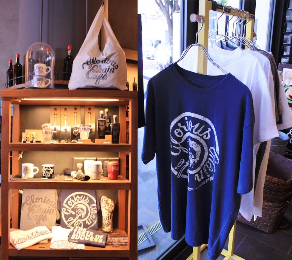 「グロリアスチェーンカフェ」のもう1つの楽しみが、オリジナルグッズです。お店で実際に使っているマグカップやTシャツなどスタイリッシュでクールなアイテムが揃います。お店のインスタグラムでは随時最新情報を発信しているのでチェックしてみて(http://www.instagram.com/gloriouschaincafe/)!