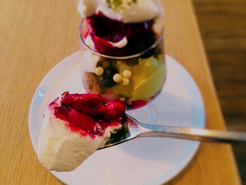 「ビヤンネートル」のパフェで楽しみたいのは、計算しつくされた食感と味わいのマリアージュ。例えば「カシス ラベンダー ピスターシュ」は、食べ進めていくと、プルプルさわやかなブラマンジェ、ザクザク香ばしいシュトロイゼル、そして濃厚かつミルキーなピスタチオのソルベ…と、次々と異なる味や食感の要素に出合います。