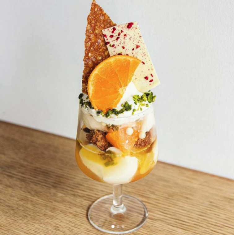 続いてこちらが、「オリーブ エルブ アグリューム」。ビタミンカラーが見た目に楽しい色鮮やかな1杯です。フルーティなスペイン産オリーブオイルで、スッキリと仕上げたジェラートやブラマンジェがたっぷり!こちらのパフェにはハーブが使われていたそうで、意外な食材をパフェとして楽しめるのもこのお店ならではのポイント!