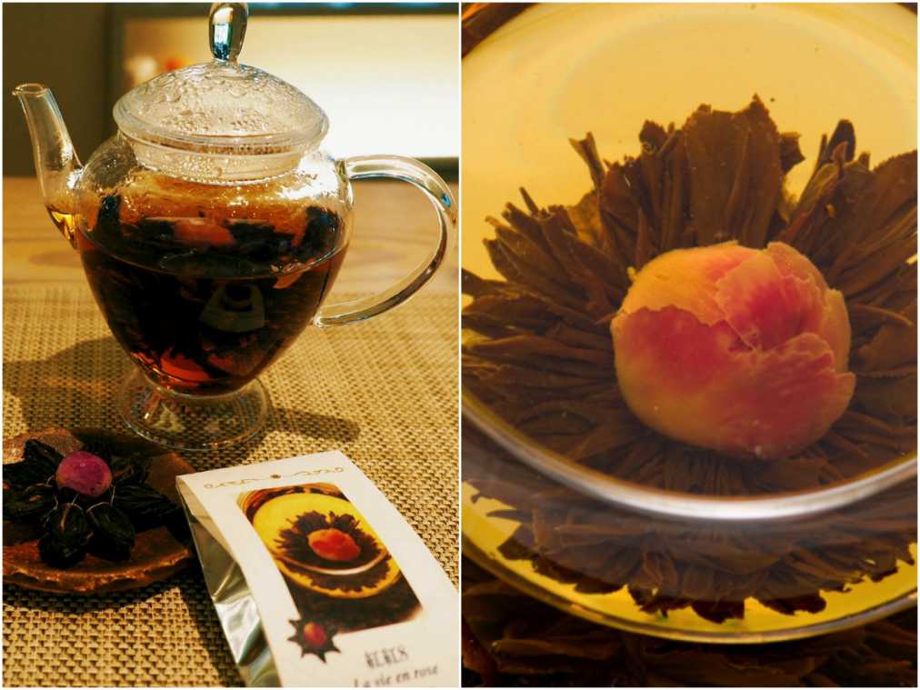 「工芸茶」とは1986年に中国で発案されたもの。手摘みの茶葉を1枚ずつ揉み、糸で束ねた中に花を入れています。これをガラスのポットに入れてお湯を注ぐと、ゆっくりと茶葉が開き、中からバラや菊、ジャスミンなどといった色鮮やかなお花が現れるのです。