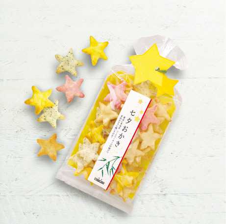 おかきも七夕仕様に!みやこがねもち米を使った「七夕おかき」(50g)432円は、カラフルな星型。サクサク食感でついつい食べ過ぎそう。【地下2階 和菓子/銀座あけぼの】