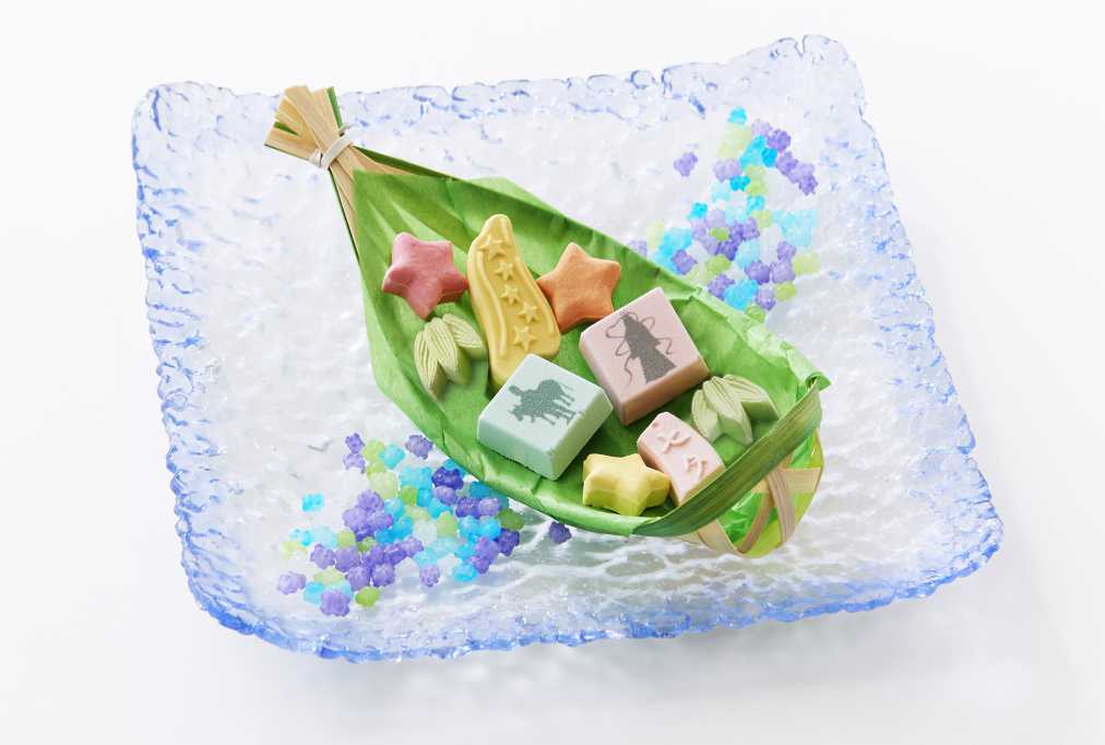 七夕をモチーフにしたお菓子がギュッと詰まった「七夕 笹舟にのせて」(52g)540円。星や短冊、笹飾りをかたどった和三盆、天の川をイメージした金平糖など、どれもカワイイ!【地下2階 菓遊庵/ばいこう堂】