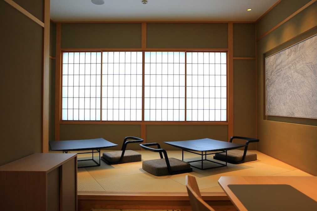 大きな絵が飾られた畳の小上がり席も。食とアート、歴史とモダンがコラボレーションしたハイセンスな雰囲気のなか、ゆったりと寛げるカフェに仕上がっています。