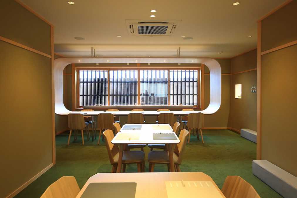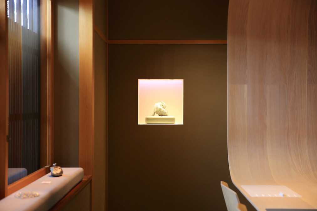 彫刻家・名和晃平氏が設計、監修した内装とインテリアは、店そのものが作品という雰囲気。ホワイトオークの曲木を組み合わせた大きなカウンターがシンボリックです。