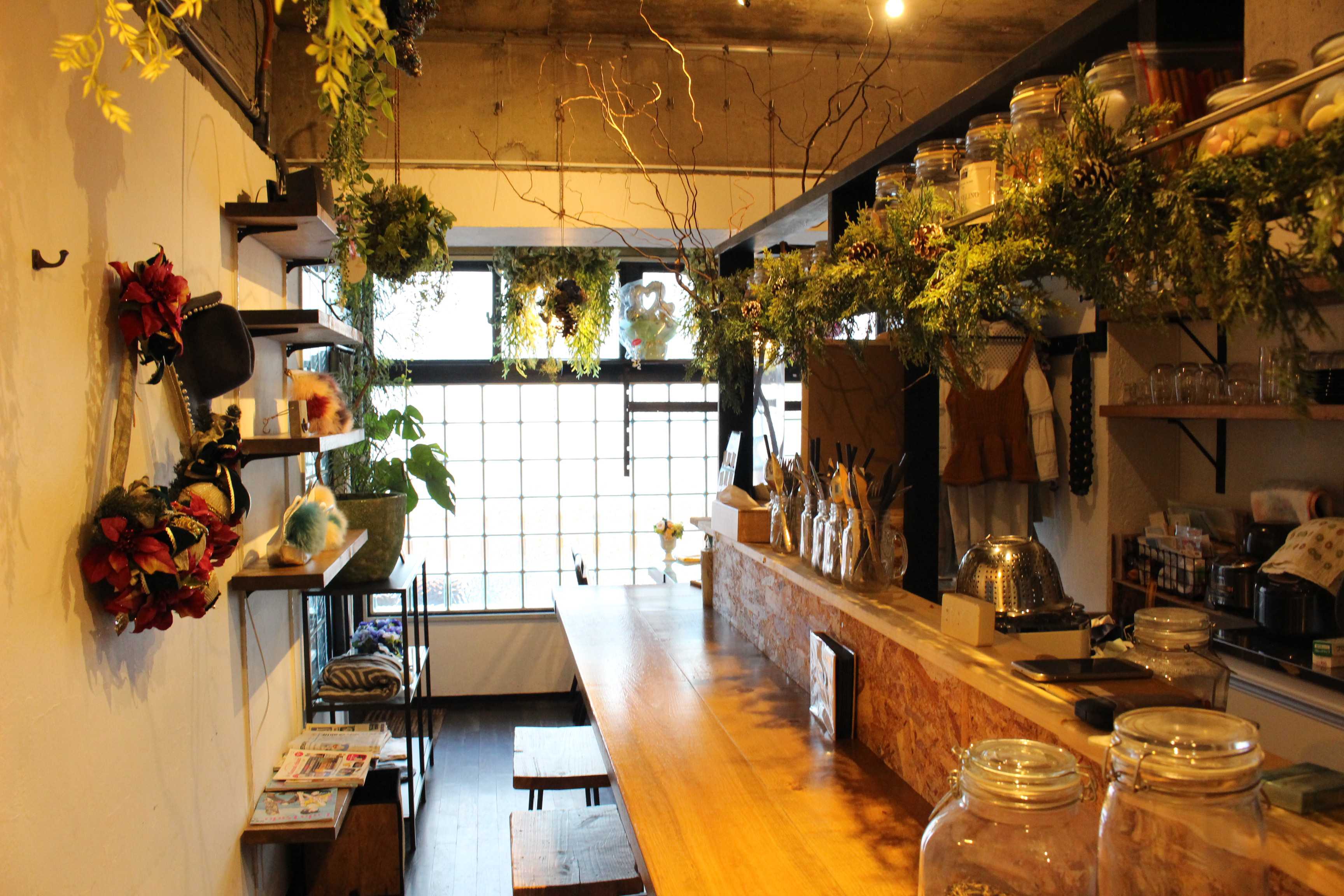 お店の空間を演出する、グリーンの装飾や照明も、芸大出身の田村さんの手作りです。