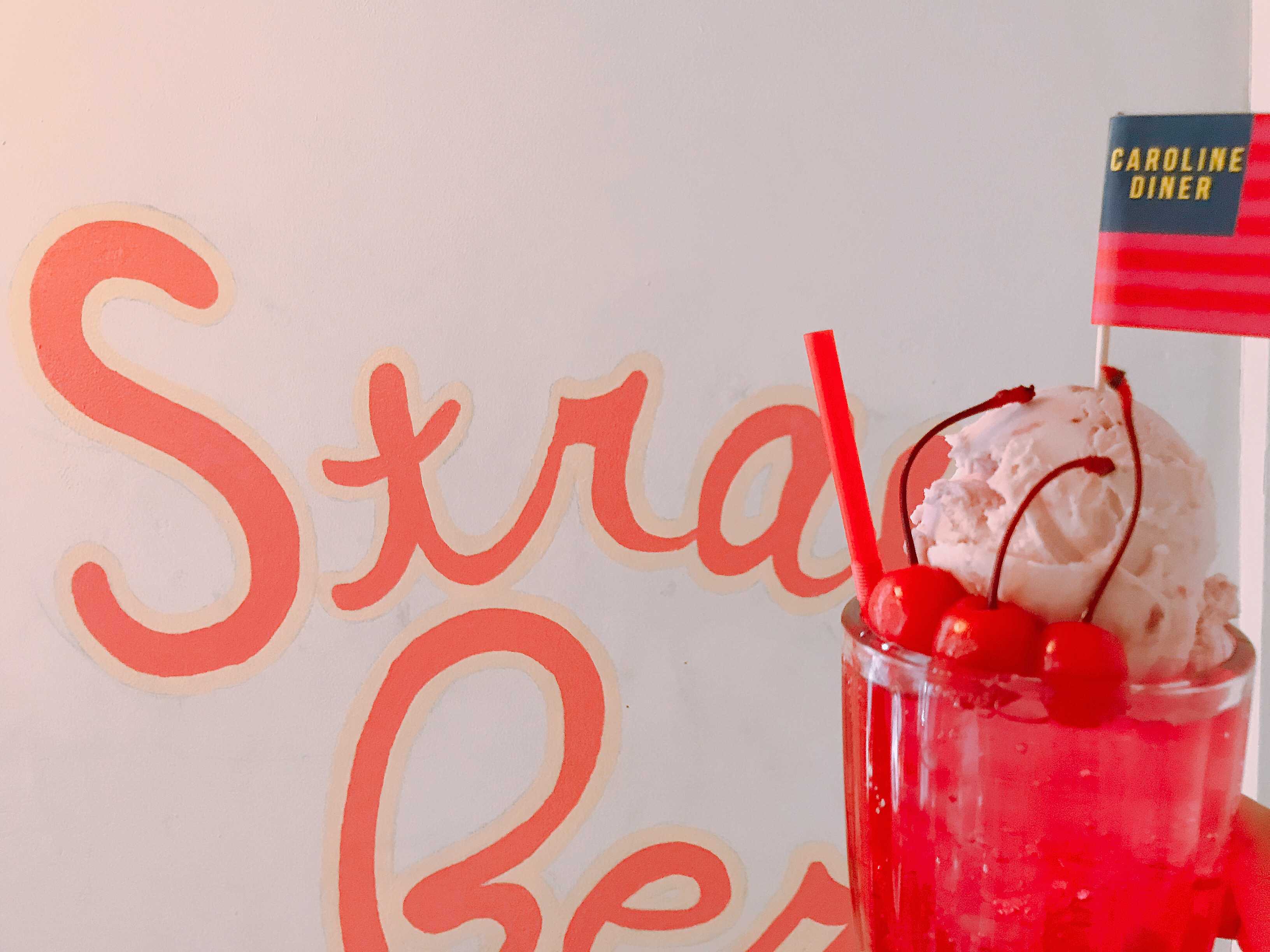圧倒的人気のフレーバーはストロベリー。ビビッドなピンク色がキュートなソーダをはじめ、アイスクリームにフラッグまでピンク尽くしで、乙女心をくすぐられること間違いなし!