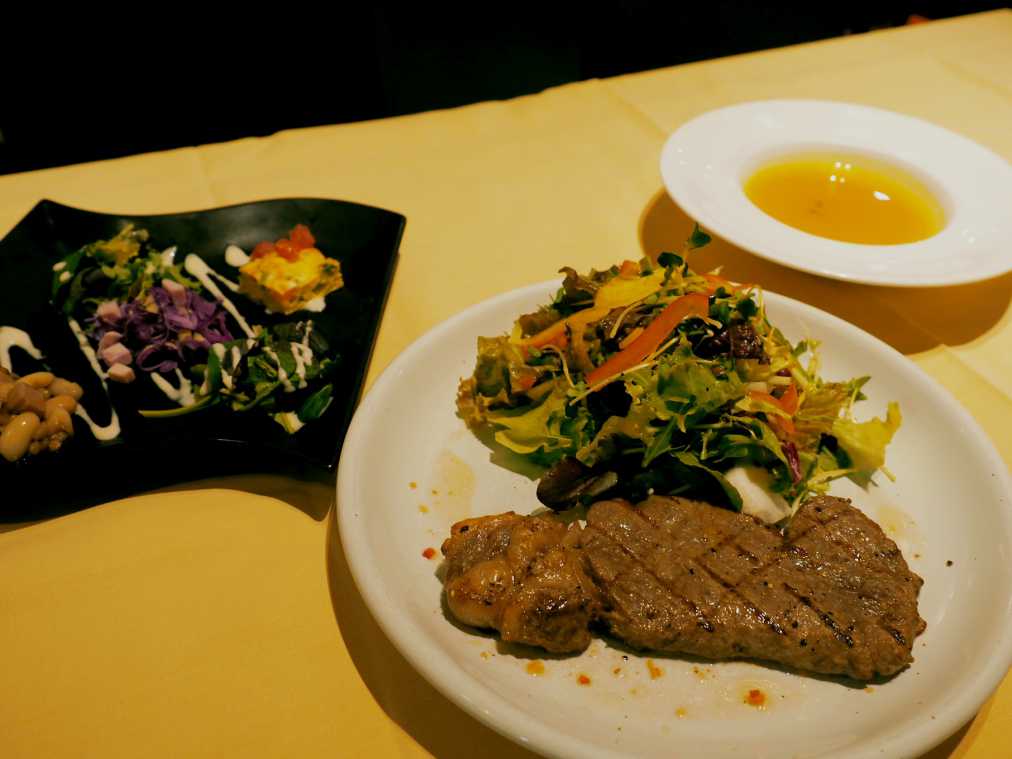 続いてご紹介するのが、ディナー限定のコースメニュー「ステーキセット」(2400円)。日替わりの前菜3種とスープに、サラダがたっぷりついたメインのステーキがセットになっています。なかなかボリューミーに見えますが、もちろん500kcal以下!コース料理でもたったの472kcalしかないのです。